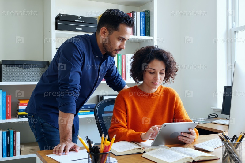 Молодая женщина использует цифровой планшет, в то время как молодой латиноамериканский мужчина наблюдает