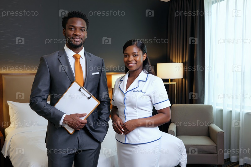 Молодой чернокожий мужчина и молодая черная женщина, стоящие вместе в гостиничном номере