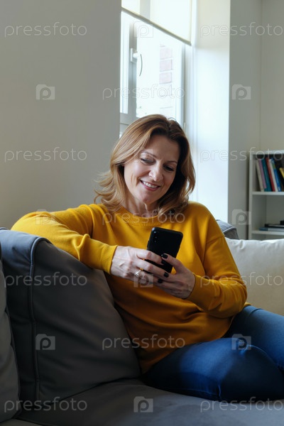 Взрослая женщина отдыхает на диване, используя смартфон в помещении