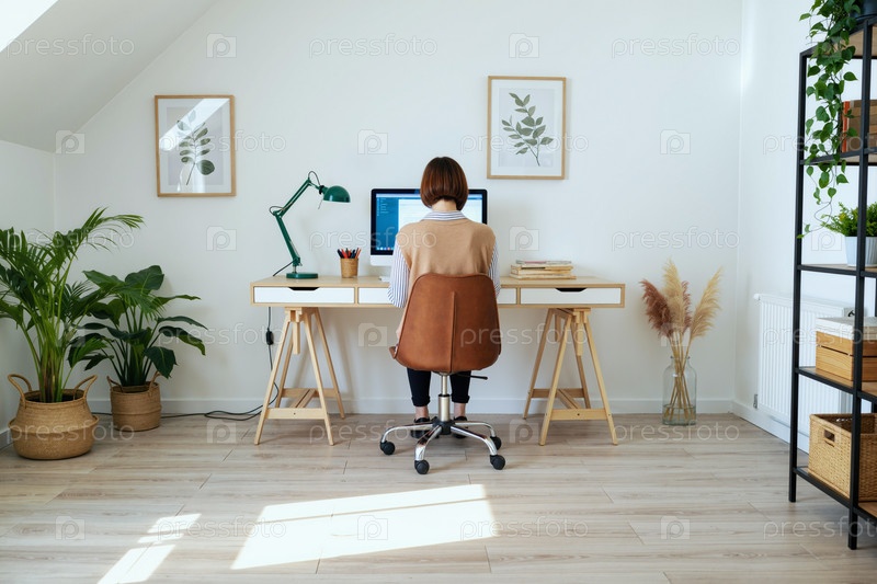 Молодая женщина, работающая удаленно на рабочем столе домашнего офиса