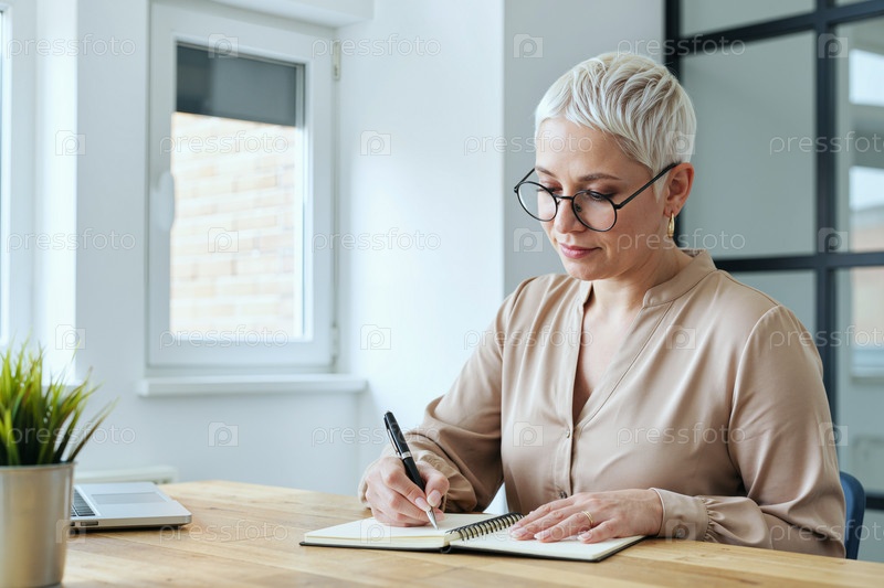 Взрослая женщина пишет записи в блокноте, сидя за рабочим столом