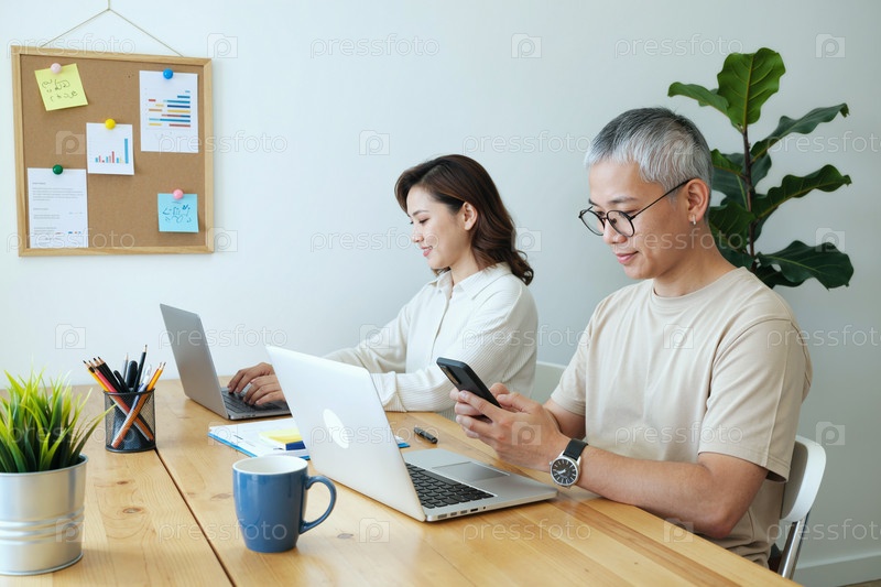 Взрослый азиатский мужчина использует смартфон рядом с молодой азиатской женщиной, работающей
