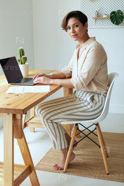 Портрет молодой женщины, работающей удаленно с помощью ноутбука
