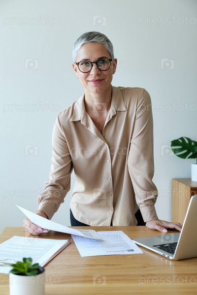 Портрет взрослой женщины, улыбающейся во время работы за столом