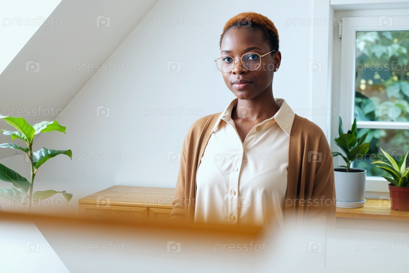 Портрет молодой чернокожей женщины с очками, стоящей в помещении