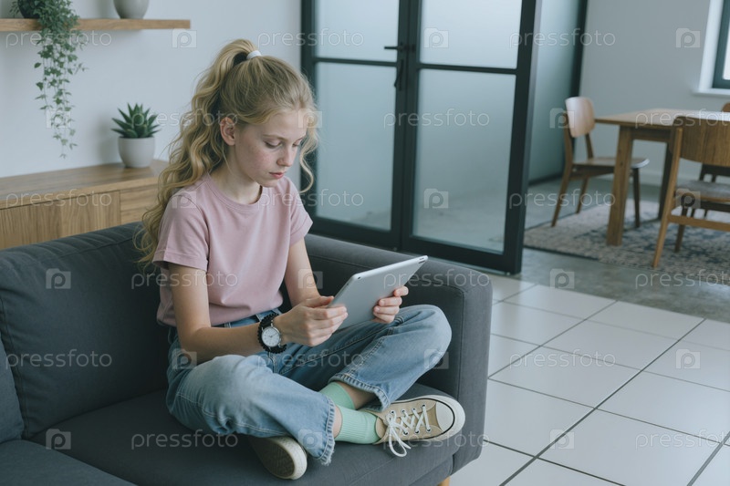 Девушка-подросток сидит на диване, используя цифровые планшеты в помещении