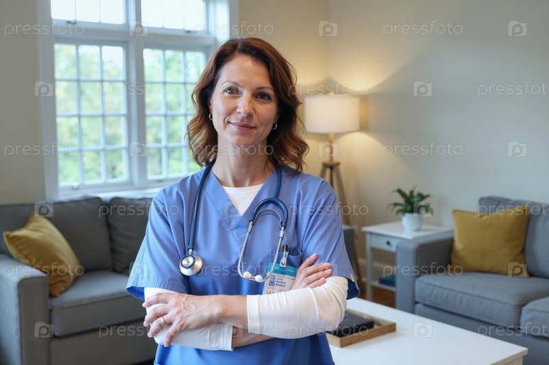 Портрет взрослой женщины-медсестры, стоящей уверенно в помещении