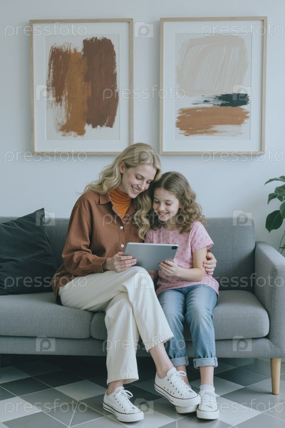 Молодая женщина и девочка сидят вместе, используя цифровой планшет