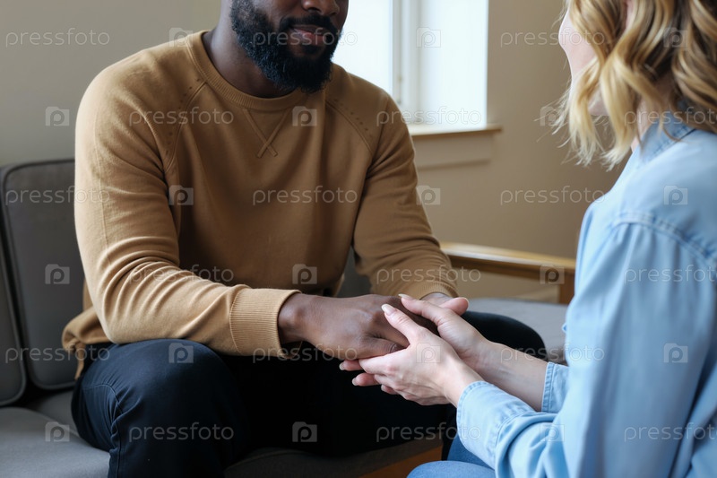 Молодой чернокожий мужчина утешает женщину во время эмоционального разговора