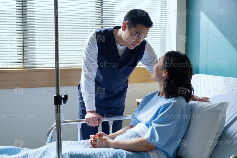 Молодой медсестра мужчина утешает молодого азиатского пациента женщины