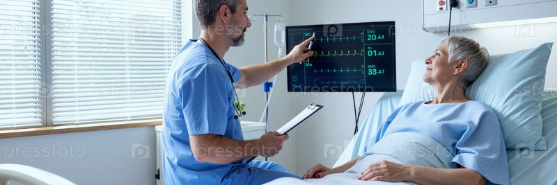 Взрослый врач-мужчина объясняет старшей женщине монитор сердца