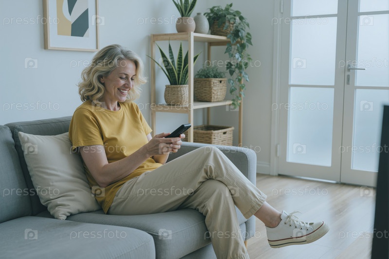 Взрослая женщина сидит на диване, использует смартфон и улыбается