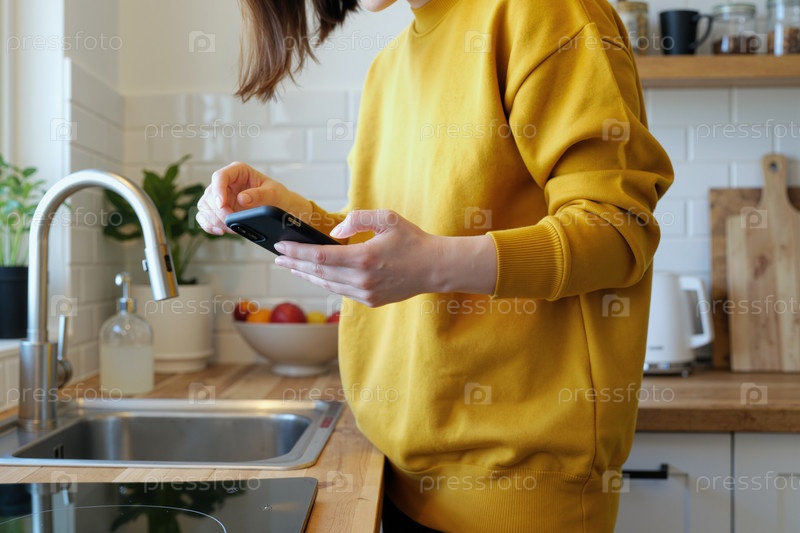 Молодая женщина, стоящая на кухне с помощью смартфона возле раковины
