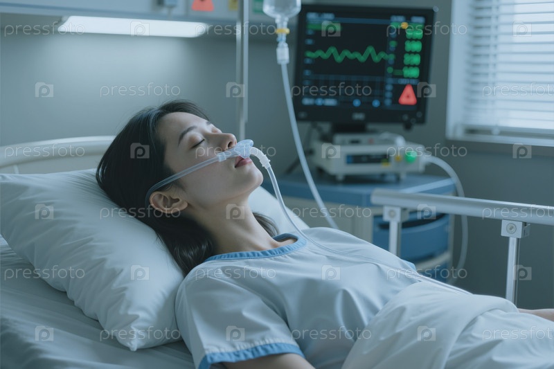 Молодая азиатская женщина лежит без сознания в больничной постели с кислородной трубкой