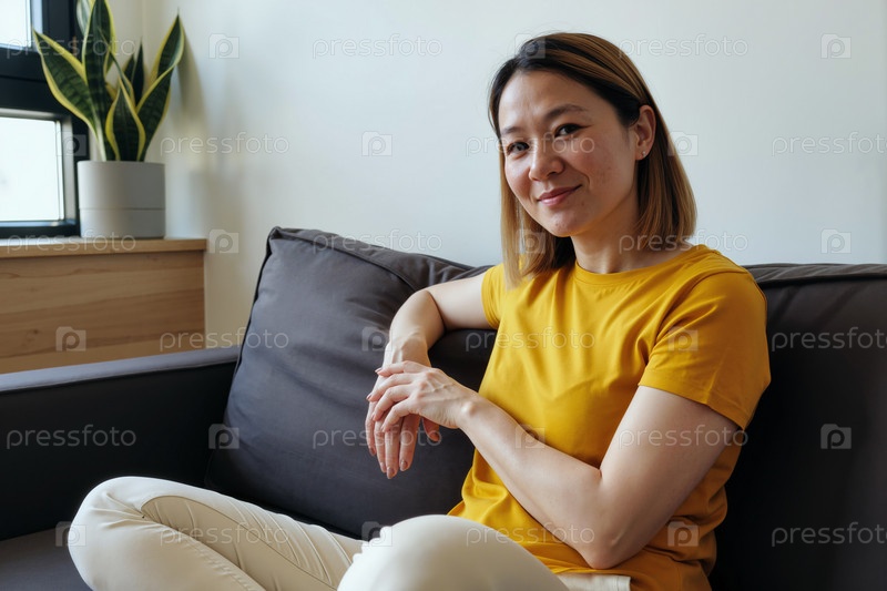 Портрет молодой азиатской женщины, сидящей на диване и улыбающейся в камеру
