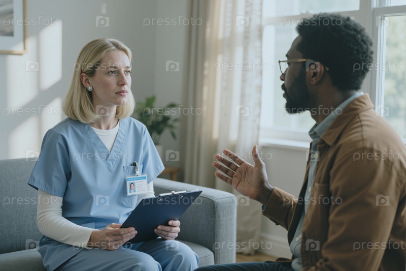 Медсестра слушает молодого чернокожего юношу, объясняющего