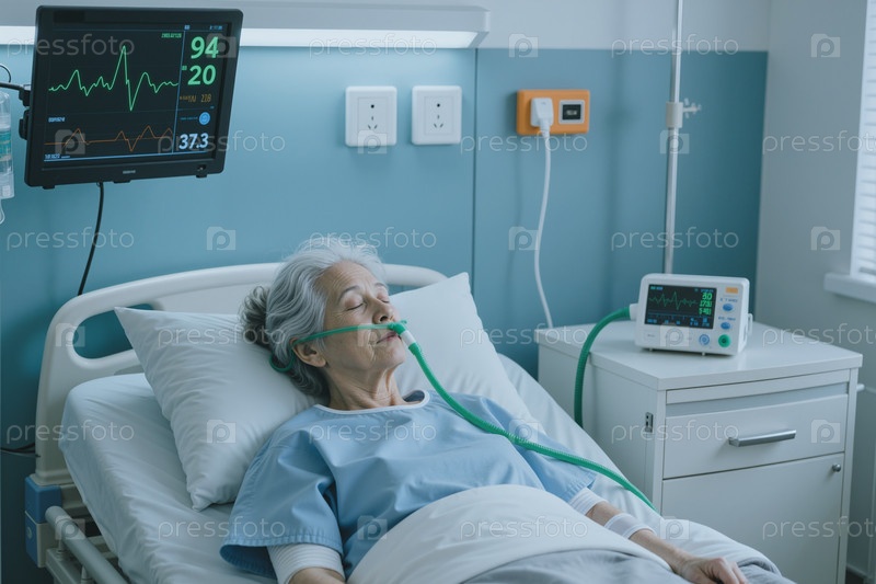 Пожилая женщина, лежащая без сознания в больничной постели с кислородной поддержкой