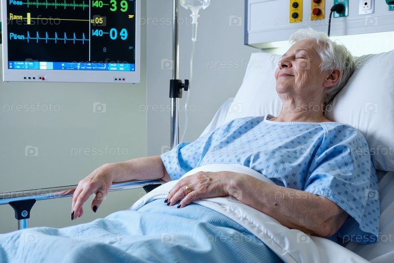 Пожилая женщина спокойно отдыхает в больничной постели во время выздоровления