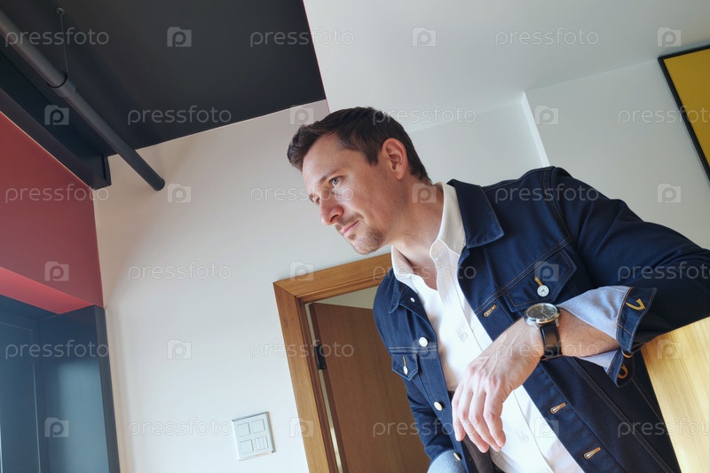 Молодой человек, опирающийся на стул и смотрящий в окно