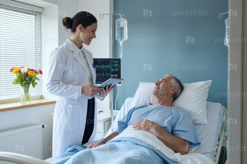 Взрослый мужчина улыбается, разговаривая с женщиной-врачом в больнице