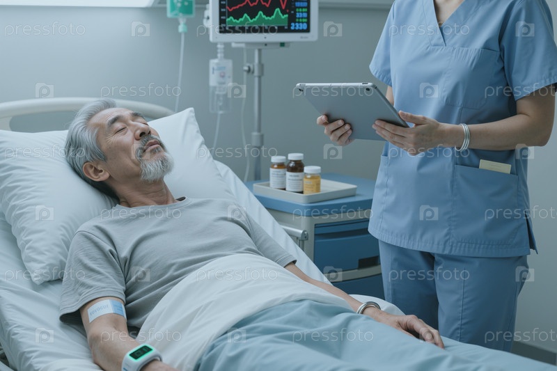 Старший азиатский мужчина отдыхает в больничной постели, а медсестра использует цифровой планшет