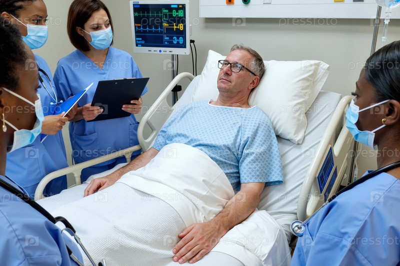 Взрослый мужчина лежит в больничной постели, окруженный медицинской командой