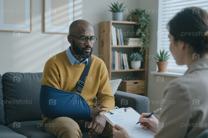 Взрослый чернокожий мужчина, носящий запястье для рук Консультационный женский терапевт в помещении