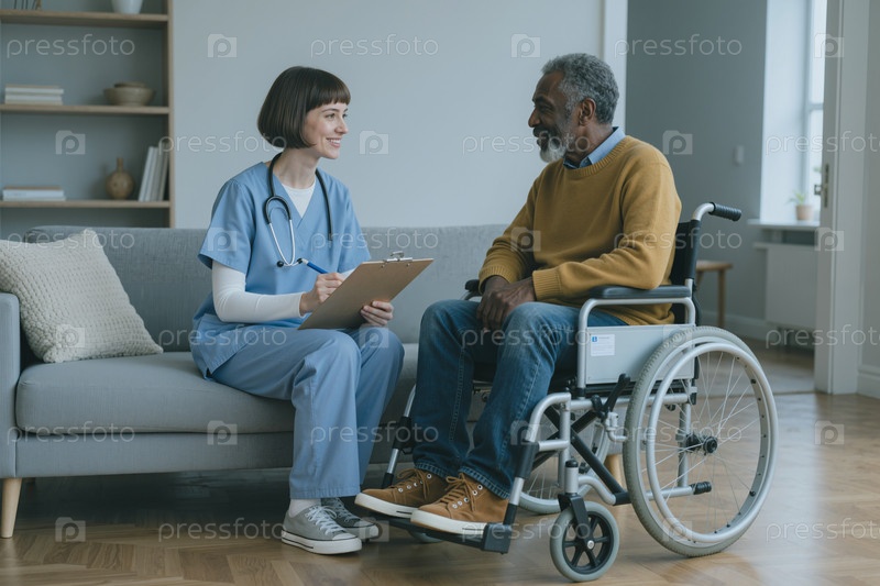 Взрослый женщина врач консультирует старшего чернокожего мужчину с инвалидностью