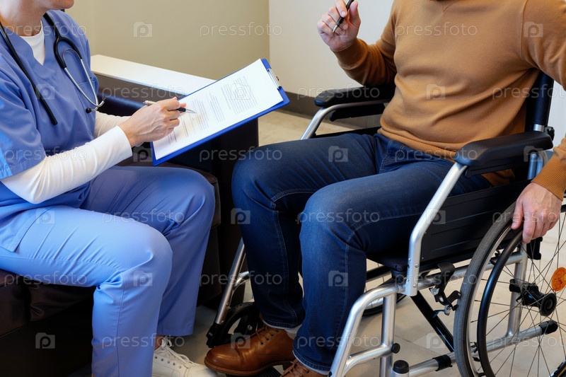 Мужчина в инвалидной коляске с инвалидностью консультирует взрослую медсестру