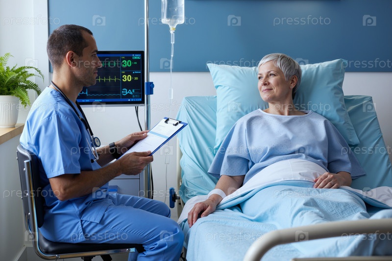 Взрослая женщина лежит в больничной постели и разговаривает с врачом-мужчиной
