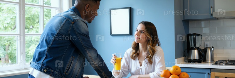 Молодая женщина пьет апельсиновый сок, разговаривая с молодым черным мужчиной
