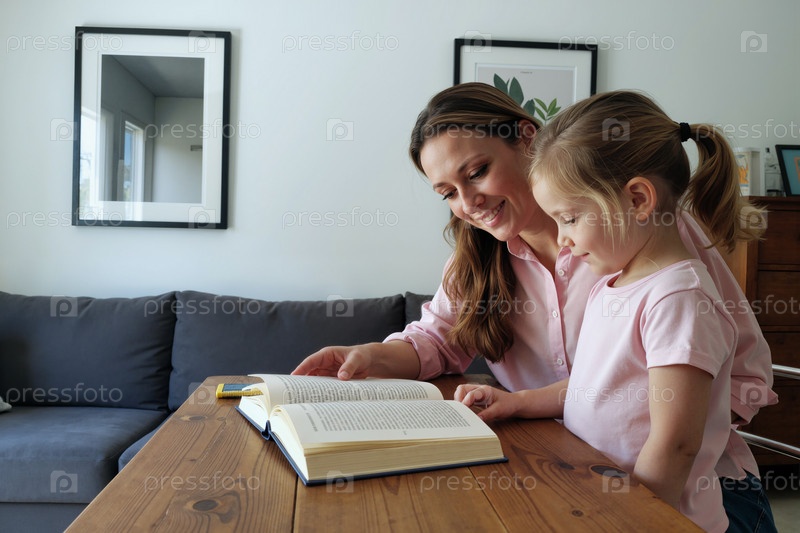 Молодая женщина, читающая книгу с ребенком-девочкой в помещении