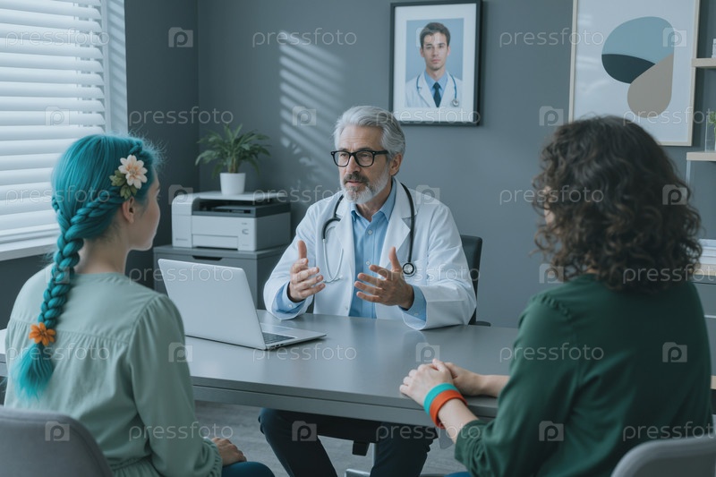 Мужской старший врач консультирует молодых женщин в медицинском кабинете