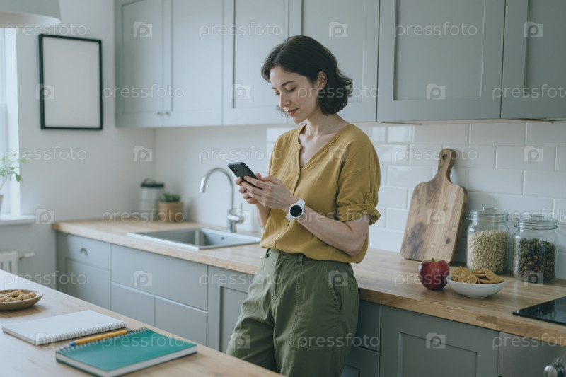 Молодая женщина стоит на кухне и просматривает содержимое смартфона