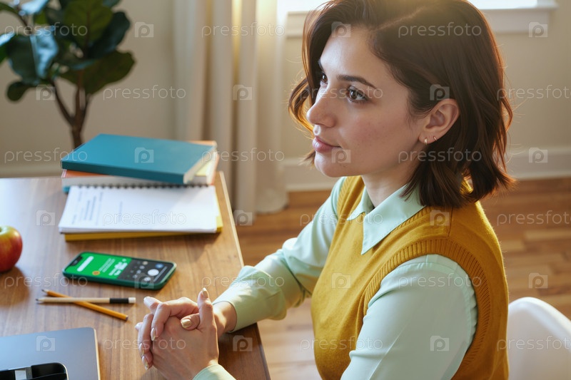 Молодая женщина, сидящая за рабочим столом и использующая смартфон для онлайн-банкинга