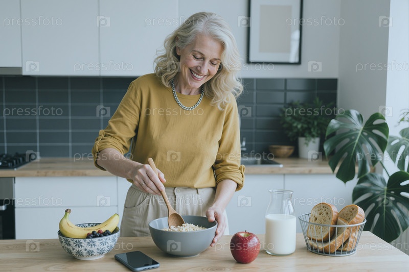 Взрослая женщина готовит здоровый завтрак на кухне