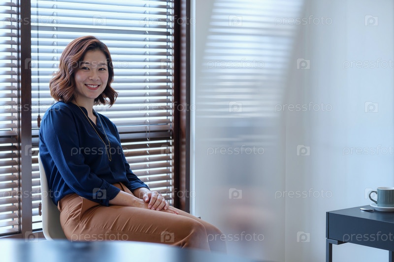 Портрет молодой азиатской женщины, улыбающейся во время работы в офисе