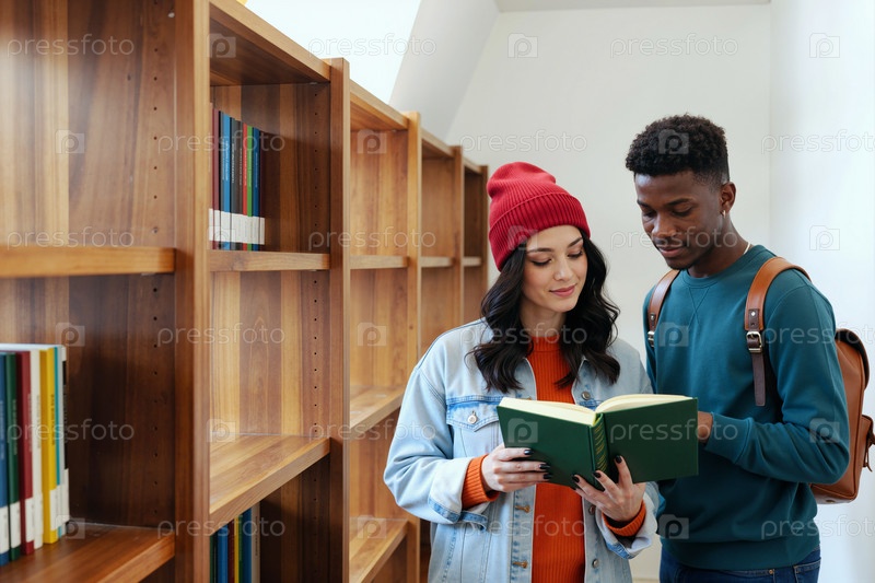 Молодая женщина и чернокожий мужчина читают книгу вместе в библиотеке