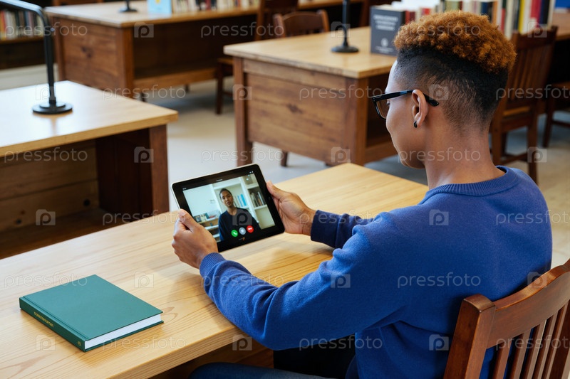 Молодой чернокожий мужчина использует планшет для видеозвонка в учебной зоне библиотеки