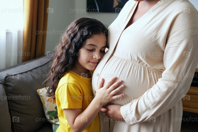 Молодая девушка обнимает беременную взрослую женщину в помещении