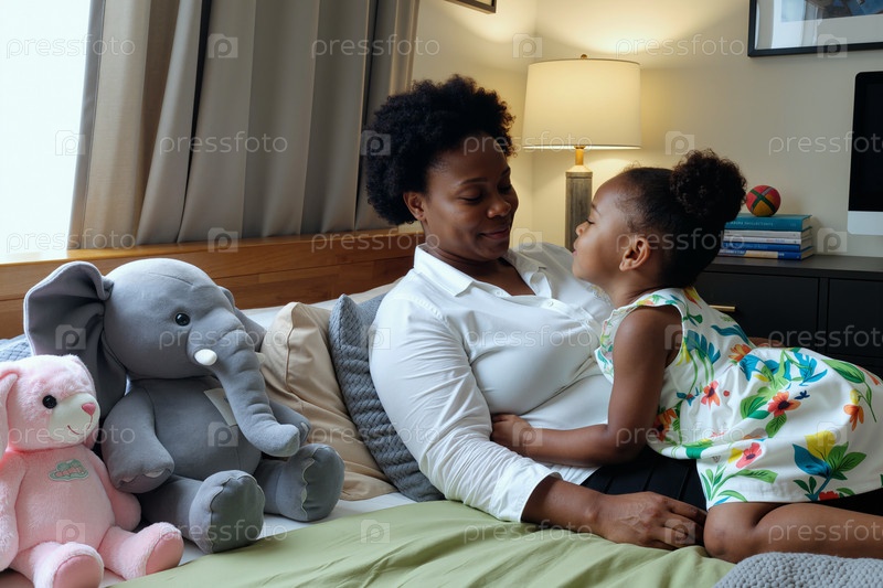 Юная чернокожая женщина улыбается, обнимая маленькую чёрную девочку на кровати