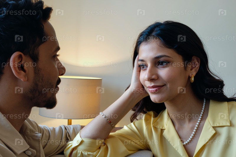 Молодая женщина улыбается, слушая молодого человека в помещении