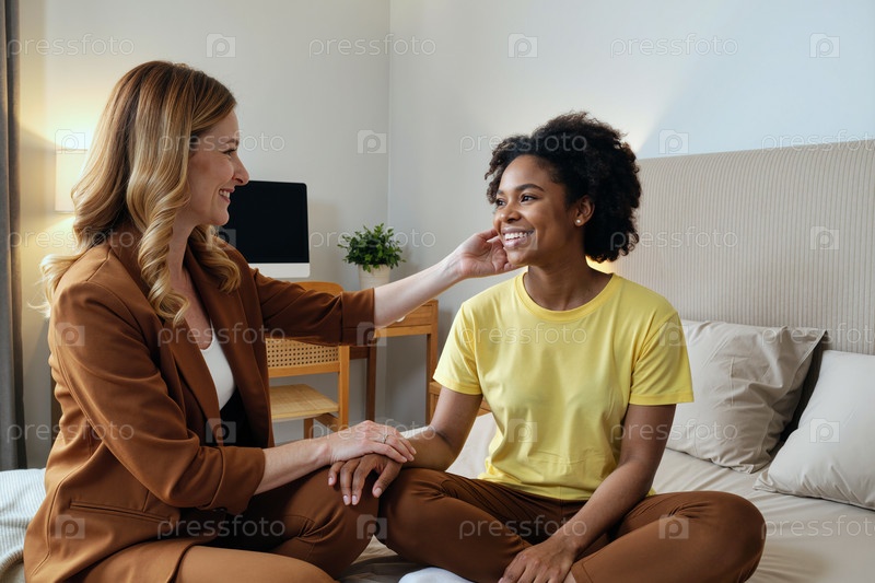 Утешительная улыбающаяся молодая чернокожая женщина, сидящая на кровати