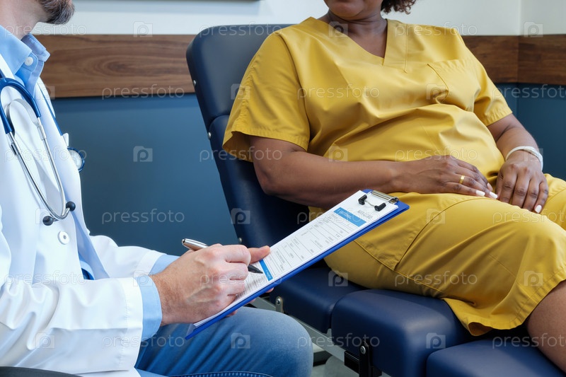 Взрослая чернокожая женщина сидит в клинике и разговаривает с врачом