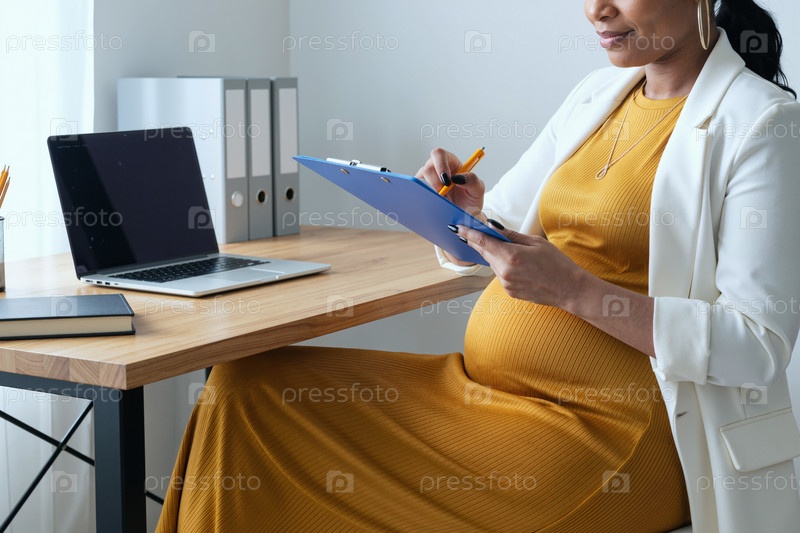 Беременная молодая чернокожая женщина, пишущая записки во время работы за столом
