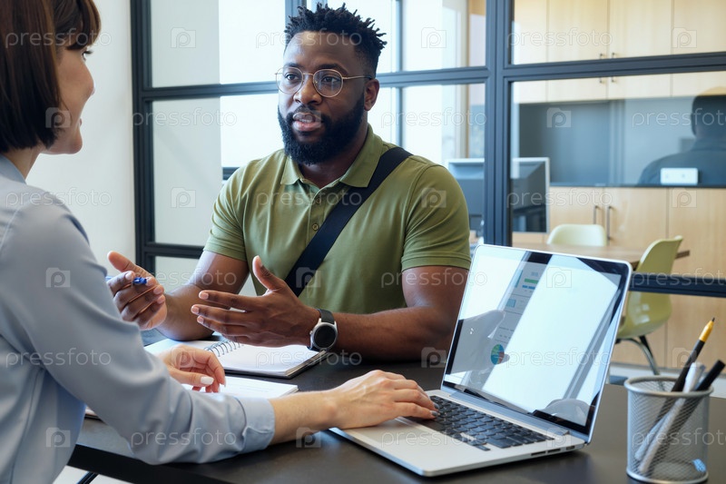Молодой чернокожий человек обсуждает проект с женщиной в офисе