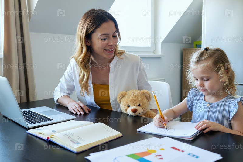 Молодая женщина помогает ребенку рисовать во время домашнего обучения