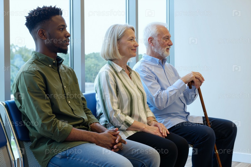 Мультиэтническая группа взрослых, сидящих в комнате ожидания и ожидающих встречи