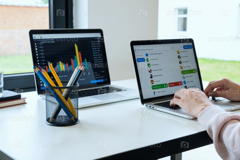 Молодая женщина использует ноутбук, анализируя онлайн-данные