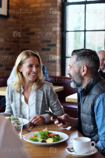 Взрослая женщина и мужчина улыбаются и разговаривают в ресторане